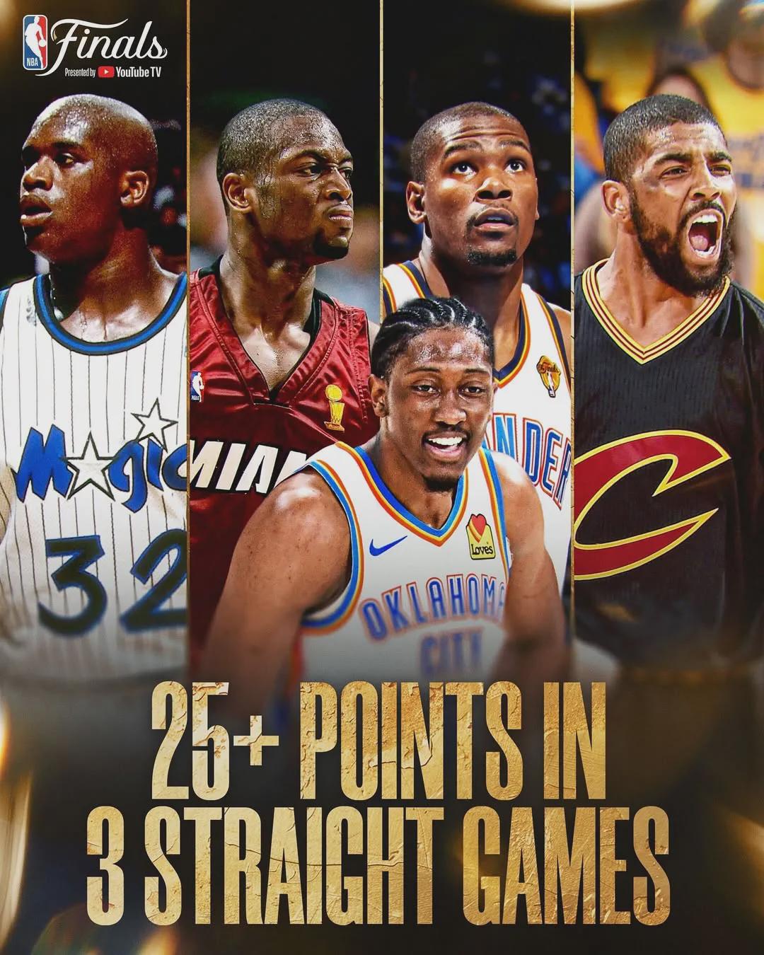 杰威成为过去40年总决赛,第五位在25岁之前连续3场砍下25+的球员,此前四位分别是:奥尼尔(1995)、韦德(2006)、杜兰特(2012)和欧文(2016)。不管雷霆今年是否夺冠,杰威都已经锁定了那份顶薪合同。
